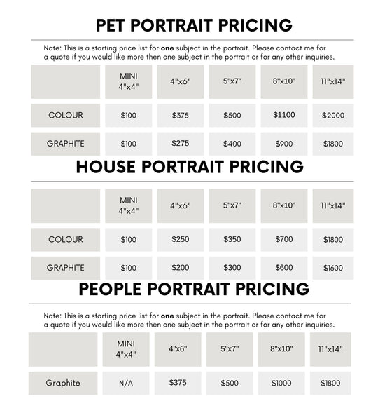 Select the size of portrait you would prefer. A lot of thought should go into this decision, not just based on the price point - think about the space your portrait will occupy in your home, and how many people or pets you would like to include in your portrait (or if you would prefer separate portraits for each). In order to create the portrait as realistic as possible, I am unable to combine several photos into one. Due to lighting purposes and different photo quality. It must be from one excisting photo. You can refer to my price list below for set sizes - custom sizes are available upon quotation.